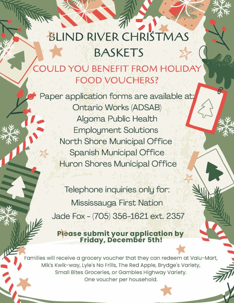 The Blind River & Area Christmas Baskets Committee is now accepting applications for this year’s holiday food voucher program. Forms can be picked up at the Huron Shores Municipal Office and must be submitted by December 5th.