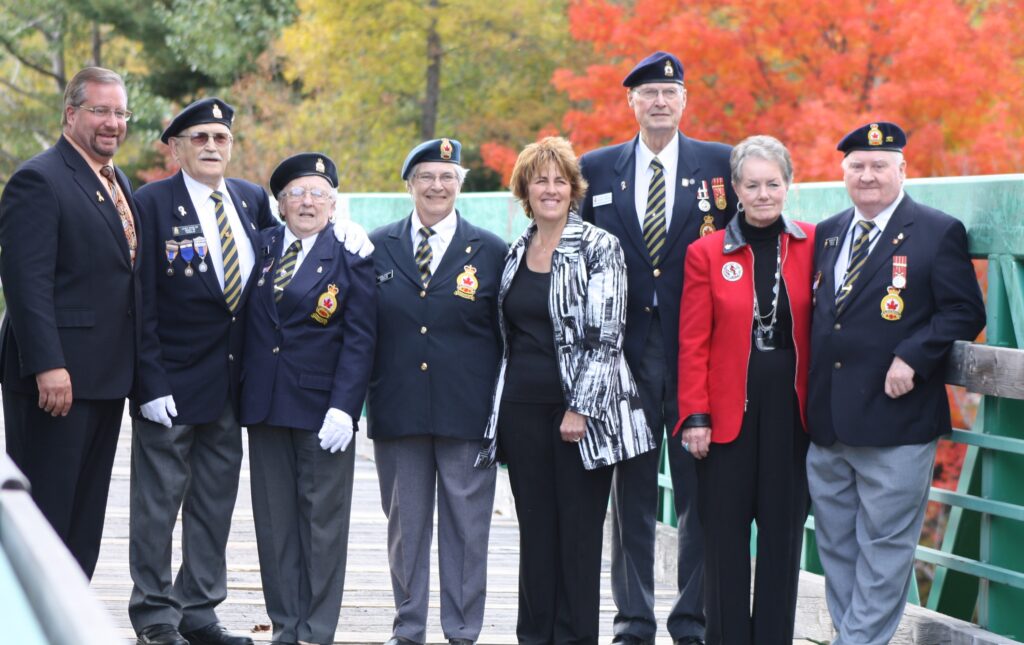 Diamond Jubilee Celebrations – September 29, 2012 September 29, 2012 Veterans Bridge Dedication On a beautiful autumn afternoon, residents of Huron Shores and area gathered in Iron Bridge at Tally Ho Park to dedicate the recreation bridge as “Veterans Bridge”. The public dedication ceremony was in honour of the 2012 Diamond Jubilee Celebration of Her Majesty Queen Elizabeth II and as such recognized the commitment to a life of service to one’s country. Dignitaries included MP Carol Hughes, MPP Michael Mantha, Mayor Gil Reeves, himself a veteran, Huron Shores veterans and members of the Royal Canadian Legion Branches 182 and 189 of Thessalon and Blind River respectively. The ceremony began at the Cenotaph with opening remarks by Royal Canadian Legion Branch 182’s Comrade Alex “Tex” Lammle, Mayor Reeves, Ms. Hughes and Mr. Mantha, followed by a solemn Act of Remembrance and the laying of wreaths. Piper Cameron Ross played The Last Lament. The dedication of the Veterans Bridge and the unveiling of the new signage concluded the ceremony. Attendees were able to mingle and stroll across the newly named bridge that spans the Mississagi River. Veterans and dignitaries then made their way to the Iron Bridge Lions Hall to enjoy an appreciation dinner followed by presentations for the veterans and the many municipal committee volunteers and fire fighters. Huron Shores veteran Mr. Russell Clearwater was presented with the 2012 Diamond Jubilee Medal. All attendees received a Diamond Jubilee Pin as a memento of the event. A collection of items depicting Her Majesty Queen Elizabeth throughout her reign and as a young princess were also on display courtesy of the Iron Bridge Historical Museum Committee. The evening ended with a Diamond Jubilee cake and a community dance with live music by local band “Jukebox”. The Mayor, Council and staff of the Municipality of Huron Shores would like to extend thanks to Comrade Alex Lammle for his expertise and advice in planning the bridge dedication ceremony; the members of the Colour Party from Thessalon Royal Canadian Legion Branch 182 for agreeing to participate in the dedication; MP Carol Hughes and MPP Michael Mantha for their enthusiastic participation in all of the day’s festivities; and, of course, all of the veterans, legion members, and the committee volunteers who made the day so memorable. The Municipality also gratefully acknowledges funding assistance from Canadian Heritage 2012 Diamond Jubilee Community Celebrations Grant.