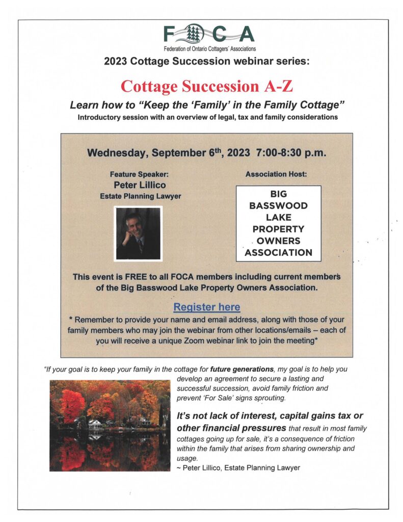 2023 Cottage Succession Webinar Series « All Events This event has passed. 2023 Cottage Succession Webinar Series 6 September 2023 @ 7:00 pm - 8:30 pm « Alzheimer Info & Discussion Group Carol Hughes, M.P. Constituency Clinic » The Big Basswood Lake Association will be hosting a Cottage Succession Webinar Series free of charge to all Federation of Ontario Cottagers’ Associations member. This session is an introductory session with an overview of legal, tax, and family considerations. Register in advance for this session through the link provided. https://us02web.zoom.us/webinar/register/WN_27cm87R9SH2qM4Z3R91v8A#/registration For more information please visit https://foca.on.ca/cottage-succession/ Add to calendar Google Calendar iCalendar Outlook 365 Outlook Live Details Date: 6 September 2023 Time: 7:00 pm - 8:30 pm Event Categories: Big Basswood Assn. AGM, Community News Event Tags:Big Basswood Lake Association, Federation of Ontario Cottagers; Associations, Information Session, Zoom Link, Zoom Registration Organizer Big Basswood Lake Association Venue Online (Zoom) View Venue Website Related Events Thessalon Pickleball 🏓 November 10 @ 6:30 pm - 8:30 pm 🌟 EarlyON Child and Family Centre 🌟 November 11 @ 9:00 am - 12:00 pm Northshore Cornhole League 🎯 November 11 @ 7:00 pm - 8:00 pm