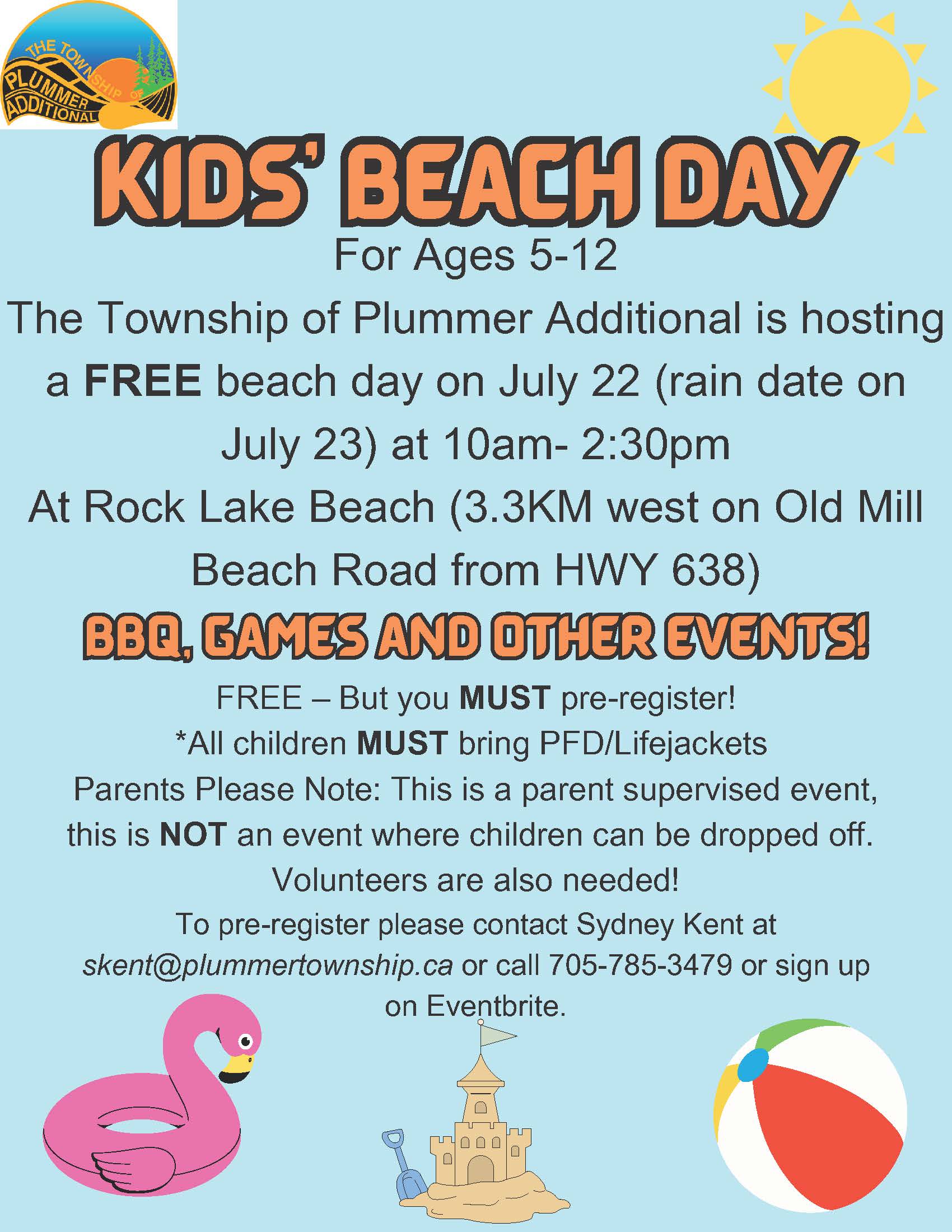 Kids Beach Day « All Events This event has passed. Kids Beach Day 22 July 2023 @ 10:00 am - 2:30 pm « Big Basswood Lake Association Annual General Meeting and BBQ Alzheimer Info & Discussion Group » The Township of Plummer Additional is hosting a free beach day at Rock Lake Beach. BBQ, games and other events will be available for children 5-12 years of age. PFD/life jackets are a must. Pre-register for this event by contacting Sydney Kent at skent@plummertownship.ca or by calling 705-785-3479. Pre-register Form Add to calendar Google Calendar iCalendar Outlook 365 Outlook Live Details Date: 22 July 2023 Time: 10:00 am - 2:30 pm Event Category: Community News Event Tags:Children Events, Community Events, Community News, Kids Beach Day Website: https://plummertownship.ca/2023/07/10/upcoming-event-kids-beach-day/ Organizer Township of Plummer Additional Phone (705) 785-3479 Email skent@plummertownship.ca View Organizer Website Venue Rock Lake Beach Old Mill Beach Road Bruce Mines, Ontario P0R 1C0 Canada + Google Map View Venue Website Related Events Children Christmas Party December 14 @ 11:00 am - 1:00 pm Thessalon Pickleball 🏓 December 15 @ 6:30 pm - 8:30 pm 🌟 EarlyON Child and Family Centre 🌟 December 16 @ 9:00 am - 12:00 pm