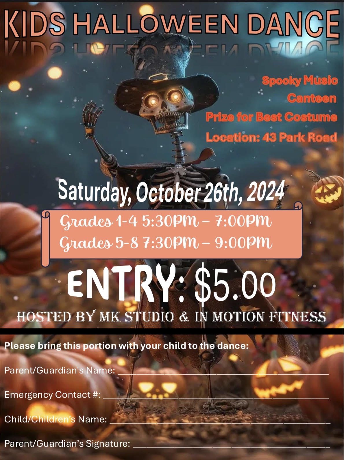 Kids Halloween Dance « All Events This event has passed. Kids Halloween Dance 26 October 2024 @ 5:30 pm - 9:00 pm « Twilight Trail Halloween Trivia Night » Join Us for a Spooktacular Kids Halloween Dance! We’re excited to announce that MK Studio and In Motion Fitness Centre are co-hosting a Halloween Dance for kids! Get ready for a night filled with: Spooky Music Fun Prizes Delicious Treats Canteen Snacks…and MORE! Date: Saturday, October 26th, 2024 Time: Grades 1-4 5:30PM – 7:00PM Grades 5-8 7:30PM – 9:00PM Location: 43 Park Road, Blind RiverImportant Info:– Permission slips will be handed out to all elementary schools in Blind River this week.– Please ensure that the parent signing the permission slip is the one picking up the child.– If you need to make alternative arrangements for pick-up, kindly note it on the back of the permission slip.We’re thrilled to connect with the Blind River community and create memorable experiences for our kids! You can also print the permission slip directly from our FB page. Please return the bottom slip with your child’s attendance to the dance!Let’s make this Halloween unforgettable! Add to calendar Google Calendar iCalendar Outlook 365 Outlook Live Details Date: 26 October 2024 Time: 5:30 pm - 9:00 pm Event Categories: Community News, Recreation Venue In Motion Fitness Centre 43 Park Road Blind River, Ontario P0R 1B0 Canada Related Events Children Christmas Party December 14 @ 11:00 am - 1:00 pm Thessalon Pickleball 🏓 December 15 @ 6:30 pm - 8:30 pm 🌟 EarlyON Child and Family Centre 🌟 December 16 @ 9:00 am - 12:00 pm