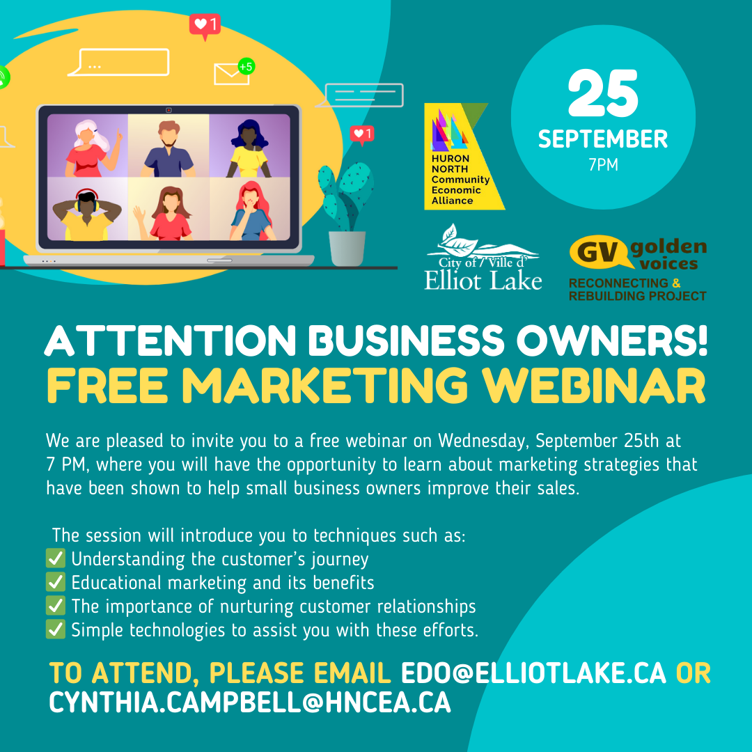 Marketing Webinar « All Events This event has passed. Marketing Webinar 25 September 2024 @ 7:00 pm - 8:00 pm « Alzheimer Info & Discussion Group Healthy Aging Fair » Add to calendar Google Calendar iCalendar Outlook 365 Outlook Live Details Date: 25 September 2024 Time: 7:00 pm - 8:00 pm Event Category: Community News Related Events Thessalon Pickleball 🏓 December 15 @ 6:30 pm - 8:30 pm 🌟 EarlyON Child and Family Centre 🌟 December 16 @ 9:00 am - 12:00 pm Northshore Cornhole League 🎯 December 16 @ 7:00 pm - 8:00 pm