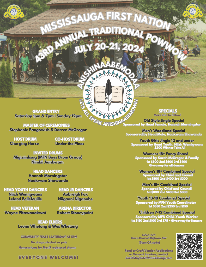Mississauga First Nation Annual Pow Wow « All Events This event has passed. Mississauga First Nation Annual Pow Wow 20 July 2024 @ 1:00 pm - 21 July 2024 @ 12:00 pm « Potluck in the Park Alzheimer Info & Discussion Group » Add to calendar Google Calendar iCalendar Outlook 365 Outlook Live Details Start: 20 July 2024 @ 1:00 pm End: 21 July 2024 @ 12:00 pm Event Categories: Community News, Recreation Event Tags:Community Event, Traditional Pow Wow Venue Mississauga First Nation Powwow Grounds Hwy 557 Blind River, Ontario P0R 1B0 Canada + Google Map Phone 705-356-1621 View Venue Website Related Events Children Christmas Party December 14 @ 11:00 am - 1:00 pm Thessalon Pickleball 🏓 December 15 @ 6:30 pm - 8:30 pm 🌟 EarlyON Child and Family Centre 🌟 December 16 @ 9:00 am - 12:00 pm