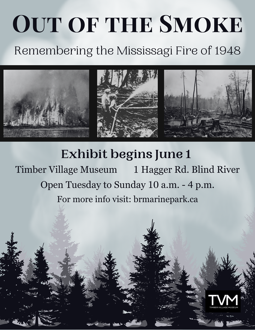 Out of the Smoke Exhibit « All Events This event has passed. Out of the Smoke Exhibit 20 June 2023 @ 10:00 am - 25 June 2023 @ 4:00 pm « Alzheimer Info & Discussion Group Alzheimer Info & Discussion Group » On May 25, 1948 at 1 p.m., aerial forest mapper Holly Parsons spotted a fire approximately 120 kilometers northwest of Blind River, near Peshu Lake. The fire was estimated to be 15 to 25 acres in size. By 4pm that day, the fire had reached 100 acres and it was clear a large number of fire fighters were needed. The fire was finally brought under control in late July but not declared fully extinguished until late August. Ultimately, 747,520 acres of prime forest were burned and the Mississagi Forest Fire is still considered the largest forest fire in Ontario’s history. Visit The Timber Village Museum exhibit Out of the Smoke. Open Tuesday to Sunday 10am-4pm. Add to calendar Google Calendar iCalendar Outlook 365 Outlook Live Details Start: 20 June 2023 @ 10:00 am End: 25 June 2023 @ 4:00 pm Event Category: Community News Event Tags:Community News, Forest Fires, Out of the Smoke Exhibit, Village Timber Museum Organizer Timber Village Museum Email museum@blindriver.ca Venue Timber Village Museum 1 Hagger Road Blind River, Ontario P0R 1B0 Canada + Google Map Phone (705) 849-3006 Related Events Thessalon Pickleball 🏓 December 8 @ 6:30 pm - 8:30 pm 🌟 EarlyON Child and Family Centre 🌟 December 9 @ 9:00 am - 12:00 pm Northshore Cornhole League 🎯 December 9 @ 7:00 pm - 8:00 pm