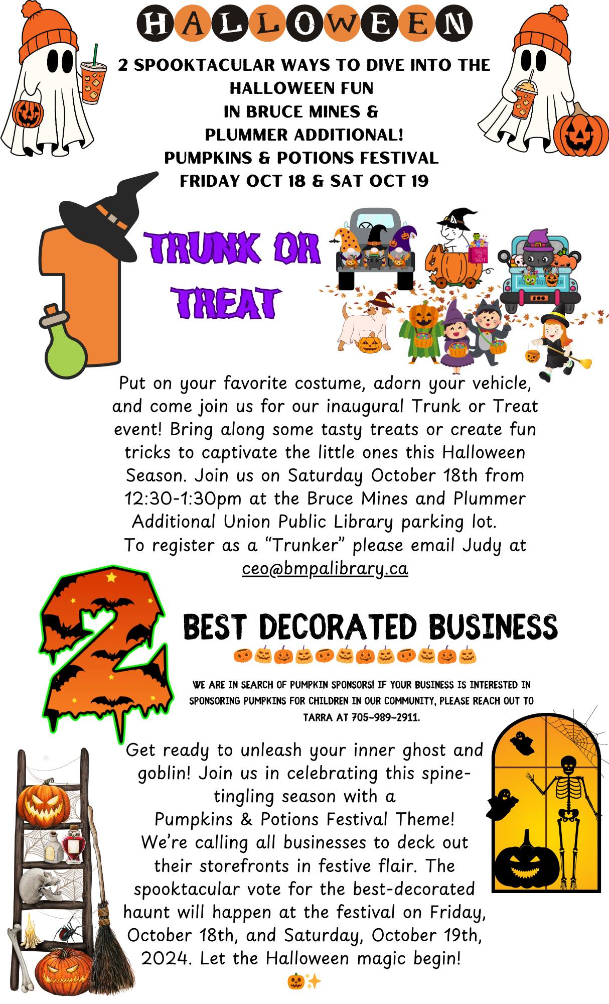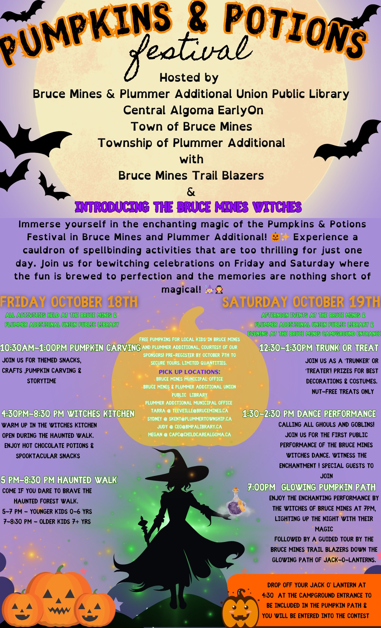 Pumpkin & Potions Festival « All Events This event has passed. Pumpkin & Potions Festival 18 October 2024 @ 10:30 am - 19 October 2024 @ 7:00 pm « Discover Huron North Geotour Alzheimer Info & Discussion Group » Add to calendar Google Calendar iCalendar Outlook 365 Outlook Live Details Start: 18 October 2024 @ 10:30 am End: 19 October 2024 @ 7:00 pm Event Categories: Community News, Recreation Related Events Thessalon Pickleball 🏓 December 8 @ 6:30 pm - 8:30 pm 🌟 EarlyON Child and Family Centre 🌟 December 9 @ 9:00 am - 12:00 pm Northshore Cornhole League 🎯 December 9 @ 7:00 pm - 8:00 pm