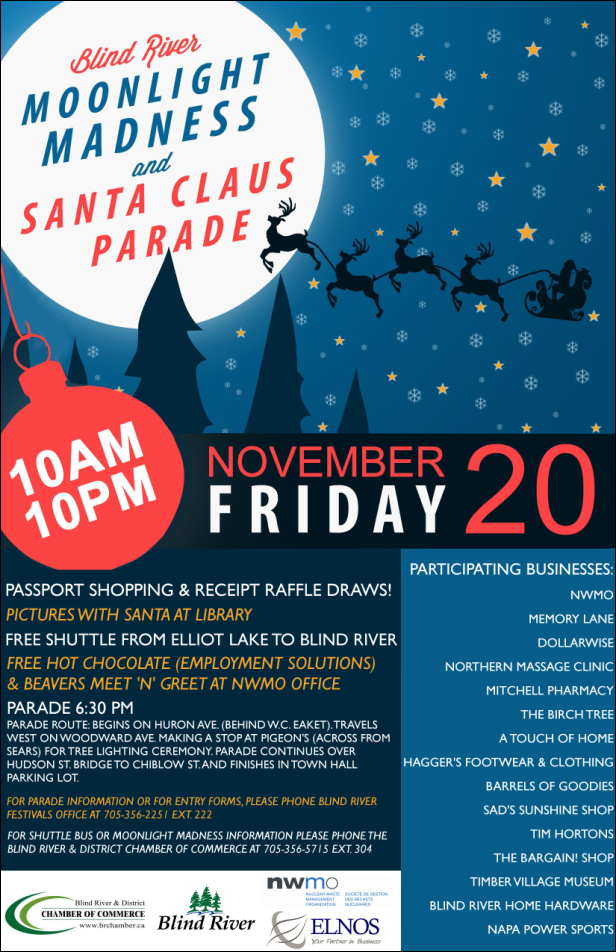 10:00 am - 10:00 pm Blind River Moonlight Madness & Santa Claus Parade 20 November 2015 @ 10:00 am - 10:00 pm Blind River Moonlight Madness & Santa Claus Parade Blind River will hold its Moonlight Madness & Santa Claus Parade on Friday, November 20/15, from 10:00 a.m. to 10:00...