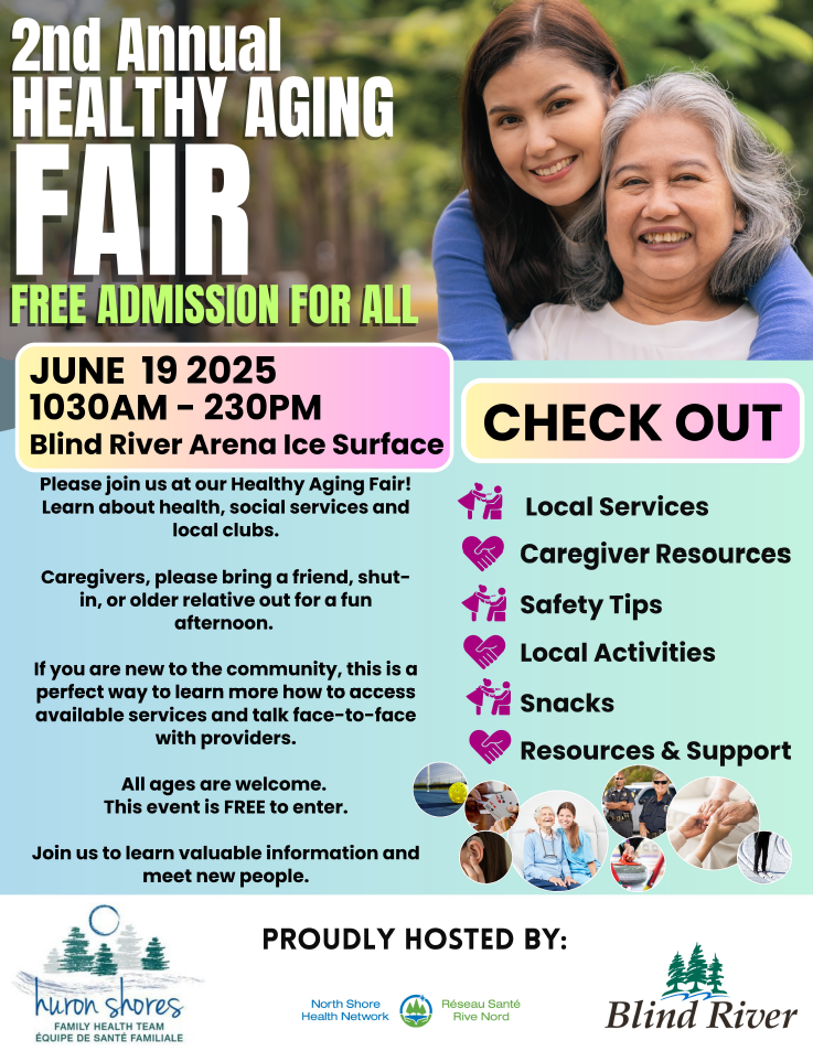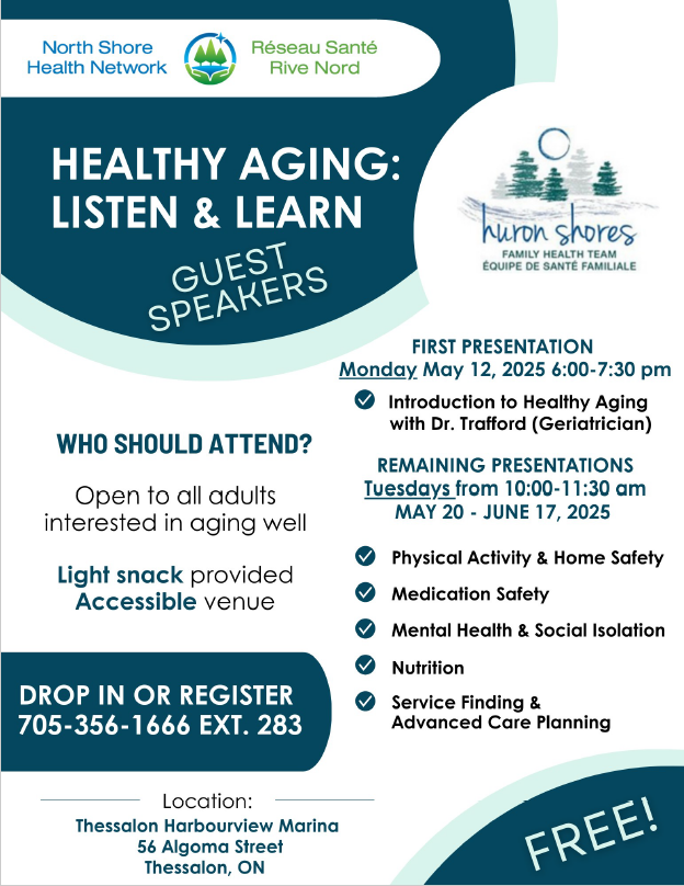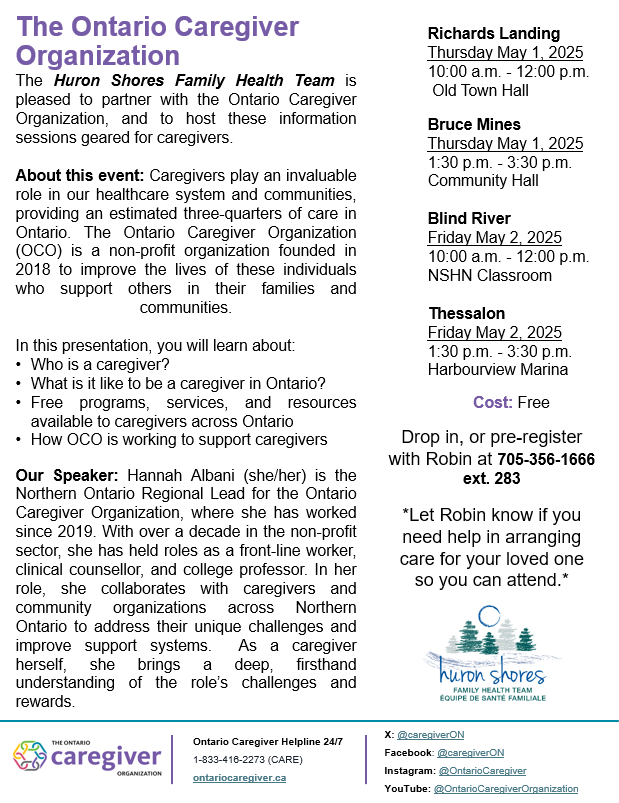 Healthy Aging Events and Resources – Open to Our Residents! We’re excited to share a number of upcoming Healthy Aging events from the Huron Shores Family Health Team happening across our region this spring and summer. These events offer valuable information, resources, and support for older adults, caregivers, and families. Upcoming Highlights: Ontario Caregiver Organization Info Sessions – May 1–2 in Richards Landing, Bruce Mines, Blind River, and Thessalon Healthy Aging: Listen & Learn – May 12, Thessalon Healthy Aging Fair – June 19 in Blind River We’re excited to share a number of upcoming Healthy Aging events from the Huron Shores Family Health Team happening across our region this spring and summer. These events offer valuable information, resources, and support for older adults, caregivers, and families. Upcoming Highlights:• Ontario Caregiver Organization Info Sessions – May 1–2 in Richards Landing, Bruce Mines, Blind River, and Thessalon• Healthy Aging: Listen & Learn – May 12, Thessalon• Healthy Aging Fair – June 19 in Blind River All events are free, open to the public, and offer a chance to learn more about local services, health and wellness, and community programs.We encourage everyone to take part! Please see the posters below for more details, including times, locations, and registration information where applicable. 👉 To explore other upcoming activities and events in our community and surrounding areas, be sure to visit the Community Events page. We look forward to seeing you there! Click to Enlarge Click to Enlarge Click to Enlarge
