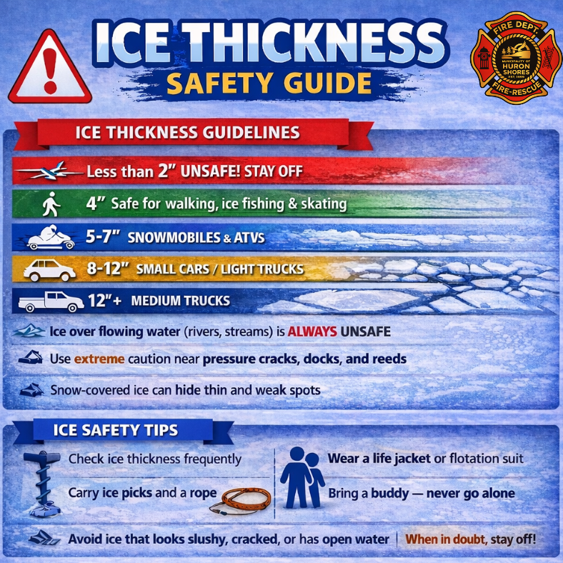 Ice Safety Reminder ❄️ Due to constant temperature fluctuations, the Huron Shores Fire Department would like to remind everyone to use extreme caution when travelling or playing on ice. Ice conditions can change within hours, even when the surface appears solid. Warmer temperatures, snow cover, and moving water can all weaken ice quickly. 📊 Ice thickness charts are for GUIDELINE PURPOSES ONLY. 🚨 If you fall through the ice:• Stay calm and avoid thrashing• Turn back toward the direction you came from• Kick your legs and pull yourself onto the ice• Once out, roll away from the hole to distribute your weight• Get to warm shelter immediately and seek medical attention 🚨 If someone else falls through the ice:• Call 911 immediately• Do NOT run toward them — this could cause you to fall through as well• Help from a safe distance using a rope, ladder, or long branch• Lie flat to distribute your weight if assisting• Keep the person warm until help arrives 👉 For more ice safety tips and emergency guidance, visit the Huron Shores Fire Department page. When in doubt — stay off the ice.