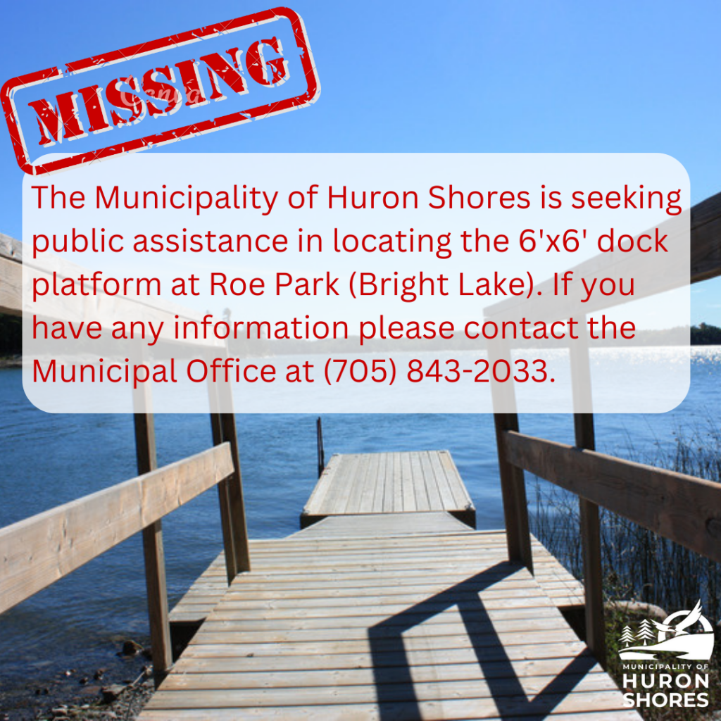 Missing Dock Platform *UPDATE* Dock has been found!! The Municipality would like to thank everyone for their help with spreading the word The 6’x6′ dock platform located at Roe Park (Bright Lake) has recently gone missing. The Municipality of Huron Shores is seeking public assistance in locating the dock platform. If you have seen the dock platform during your travels on Bright Lake, or have any information regarding the whereabouts, please contact the Municipal Office at (705) 843-2033.