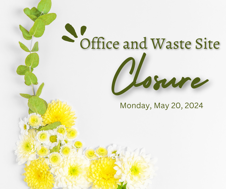 Office and Waste Site Closure – May 20, 2024 Please be advised that the Municipal Office and ALL Municipal Waste Sites will be CLOSED on Monday, May 20, 2024, in observation of Victoria Day 🌼 ♻️ Waste Sites will re-open on Wednesday, May 23, 2024, from 4:00 p.m. to 8:00 p.m. Have a safe and enjoyable weekend! ☀️
