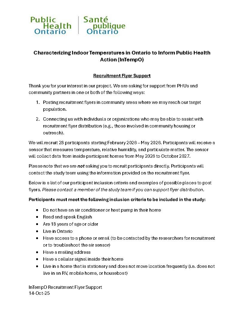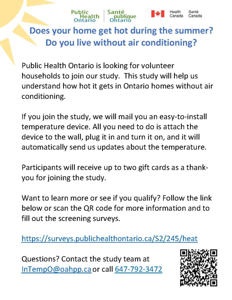 Public Health Ontario Heat Study 📊 🌡️ Does your home get hot during the summer?🥵 Do you live without air conditioning? Public Health Ontario is conducting a study to help understand how hot it gets in Ontario homes without air conditioning. If you take part, a small, easy-to-install temperature device will be mailed to you. Simply attach the device to the wall, plug it in, and turn it on—it will automatically send temperature updates throughout the study period. 💳 Participants may receive up to two gift cards as a thank-you. Want to learn more or see if you qualify? Follow the link below or scan the QR code on the flyer to complete the screening survey:🔗 https://surveys.publichealthontario.ca/S2/245/heat Questions? Contact the study team:📧 InTempO@oahpp.ca📞 647-792-3472 Click Image to Enlarge Click Image to Enlarge