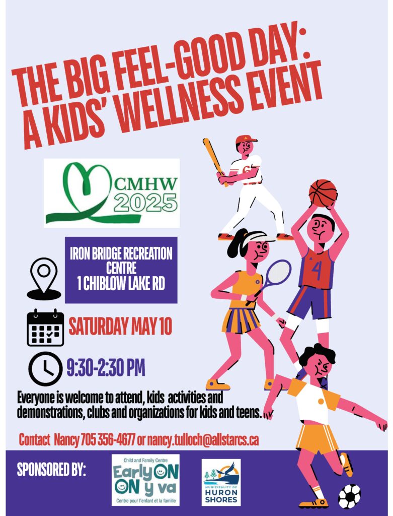 The Big Feel-Good Day: A Kids’ Wellness Event You’re Invited – Celebrate Kids Mental Health Week!FREE Community Event | Saturday, May 10, 2025Iron Bridge Recreation Centre | 9:30 AM – 2:30 PM (Tentative Time) In celebration of Kids Mental Health Week, the Iron Bridge EarlyON Centre and the Municipality of Huron Shores invite local clubs, organizations, farms, and camps that offer programming for children and youth to participate in a special community event! This is a wonderful opportunity to: Showcase your group or organization Promote your programs to families in the area Offer demonstrations of your sport or activity Connect with children, youth, and parents We’re looking to include demonstrations of dance, karate, soccer (in our outdoor fenced area), 4-H, and more! Riding stables and farms are welcome to bring animals, and we’ll have space available for larger displays as needed. Each group can request one or two tables to share information. A kids’ activity area and a stage will be available for performances or skill demonstrations. 💡 Have a fun idea for your booth? We’re open to creative suggestions! 📞 To book your spot or for more information, contact: Nancy at 705-356-4677 or nancy.tulloch@allstarcs.ca Huron Shores Municipal Office at 705-843-2033 🎉 Bonus: A great opportunity for teens to earn volunteer hours! Let’s work together to support youth mental wellness and celebrate the incredible programs in our community!