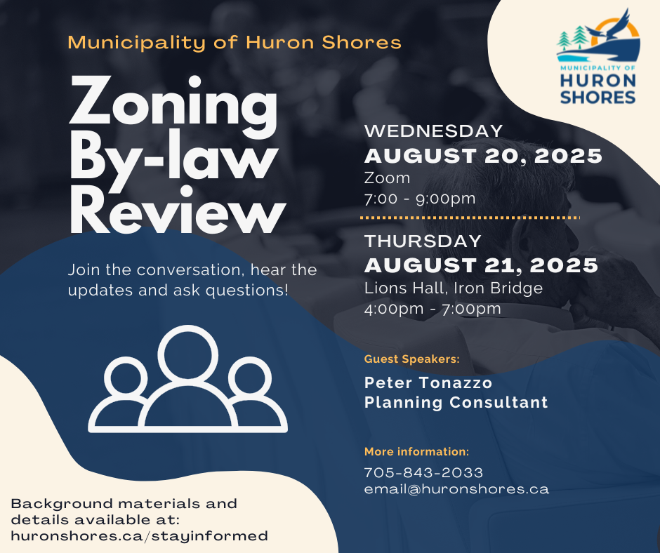 Zoning Bylaw Review – August 20, 2025 Reminder: Zoning By-law Review – First Public Session Tomorrow! 📣 Join us online tomorrow, Wednesday, August 20 at 7:00 p.m. for the Virtual Open House on the 2025 Comprehensive Zoning By-law Review. 🗣️ Hear from our Planner – Peter Tonazzo will present the proposed changes and have time for a Q&A.📥 Materials Available Online – The presentation and Q&A will be recorded and posted after the session.🏛️ Have More Questions? – Come speak with staff at the In-Person Open House on Thursday, August 21 from 4:00–7:00 p.m. at Lions Hall, Iron Bridge. 🔗 All details, background report and the Draft By-law are available at: www.huronshores.ca/stayinformed Let your voice be heard—help shape the future of land use in Huron Shores. Questions now? Send them in! email@huronshores.ca or at the municipal office.